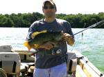 Jim, the magic combination was a slip bobber and a night crawler in about 17' of water off a 10' rock bar. It was kind of funny the large bass were almost on the bottom, but we had a couple of gills as we were bringing them in there were a bunch of small (less than 10") bass chasing after the gills trying to steal the bait from them. It was just one of those days and it probably won't happen like that again any time soon. I really enjoyed fishing this way, you never knew what was going to be on the other end until you set the hook. If it was a bass set the hook and hang on, they would make a heck of a run before you could get them in the boat.